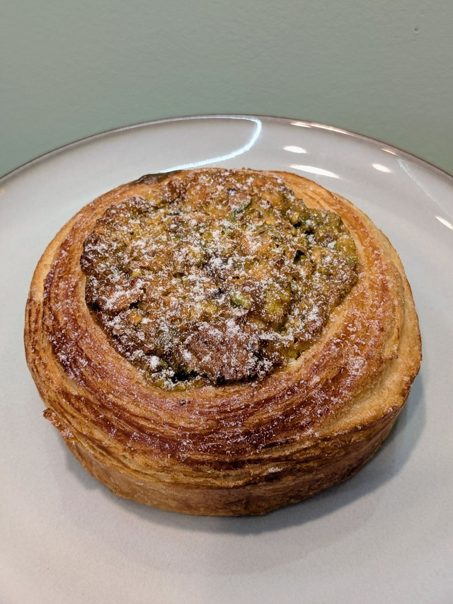 Brioche fourrée avec un intérieur pistache et nougatine pistache sur le dessus.